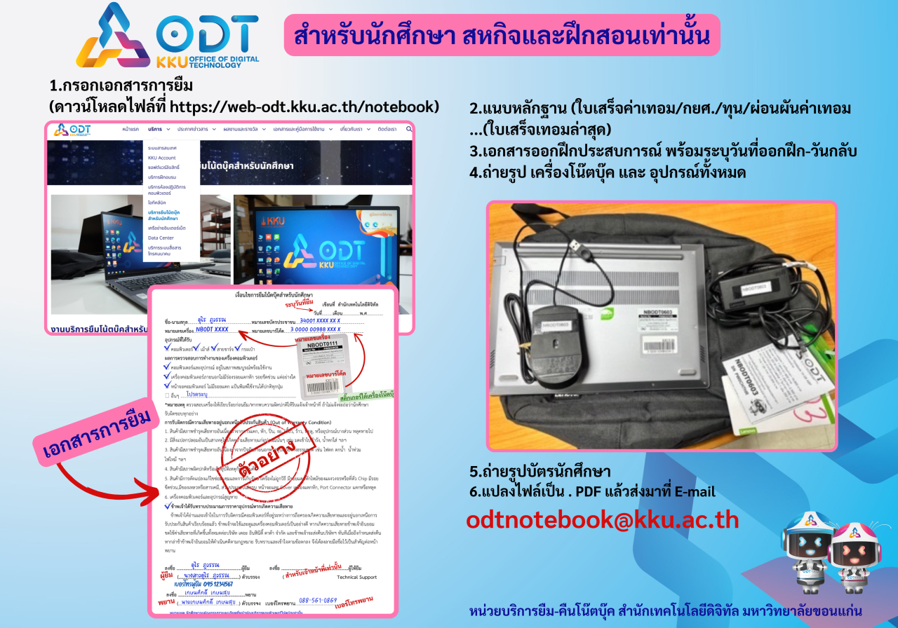 - กรณี ที่ไม่สามารถส่งคืนคอมพิวเตอร์โน้ตบุ๊ก (Notebook) และอุปกรณ์ต่อพ่วง ภายในระยะเวลาที่กำหนดไว้ ด้วยเหตุสุดวิสัย ให้แจ้งงานบริการยืมโน้ตบุ๊ก ชั้น 5 อาคารศูนย์สารสนเทศ เพื่อพิจารณาเป็นกรณี ๆ ไป